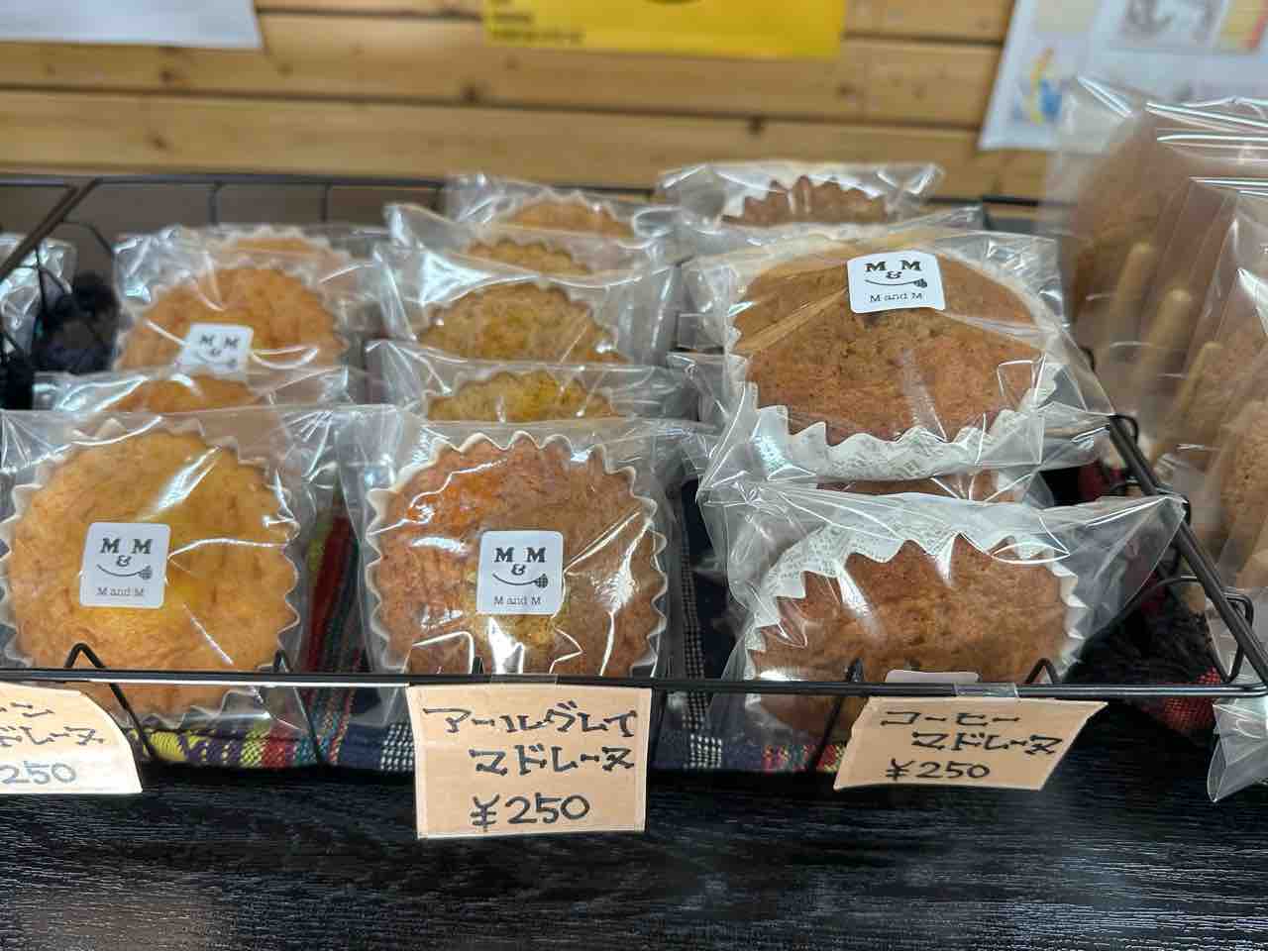焼き菓子の種類も豊富で、特に人気のマドレーヌはプレーン、アールグレイ、コーヒーなど多彩なフレーバー(各250円)が揃い、手土産にも最適。