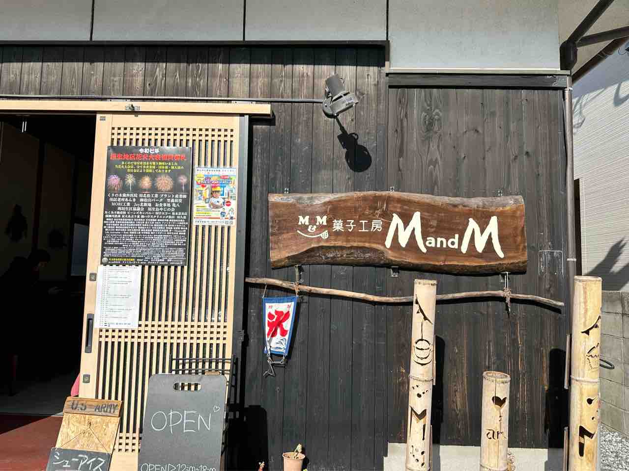 黒い板壁には木製の大きな看板が掲げられ、素材の質感から“手作りのお菓子が並ぶ店”というイメージが自然と伝わります。竹細工の小物や季節の飾りが控えめに飾られ、華美ではない温かさが漂うところも魅力。