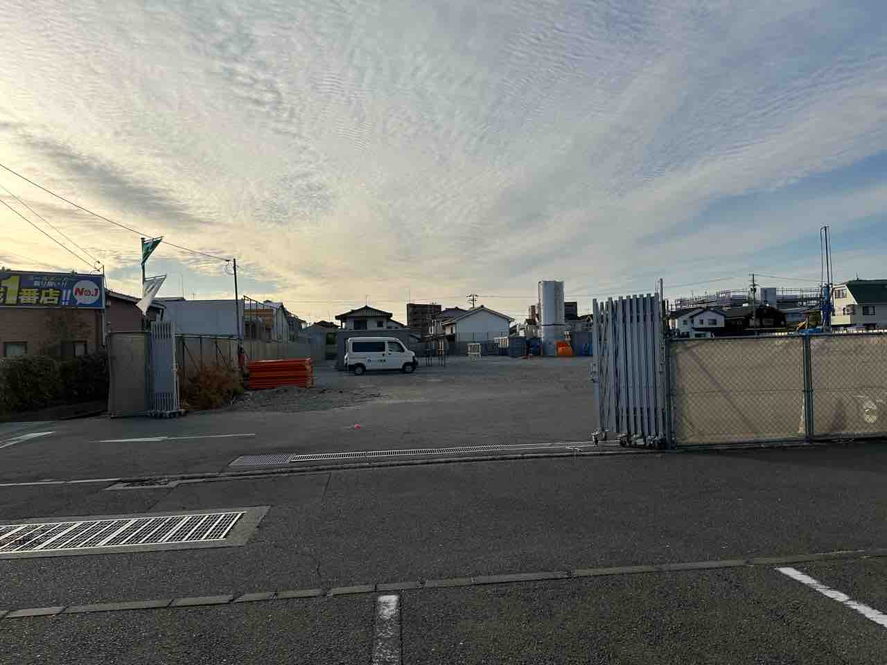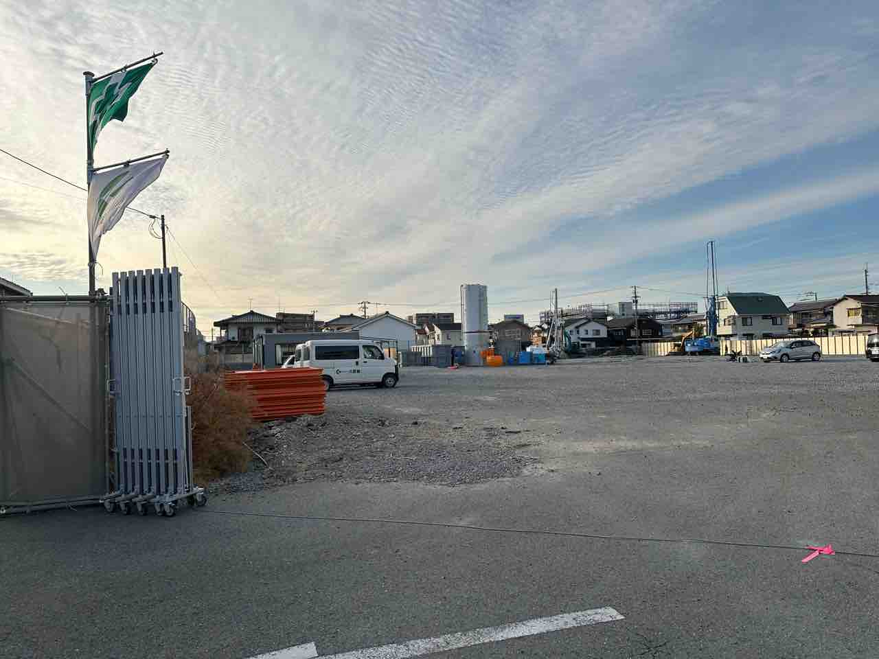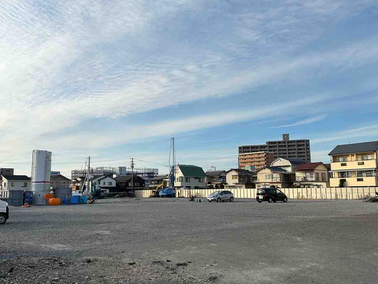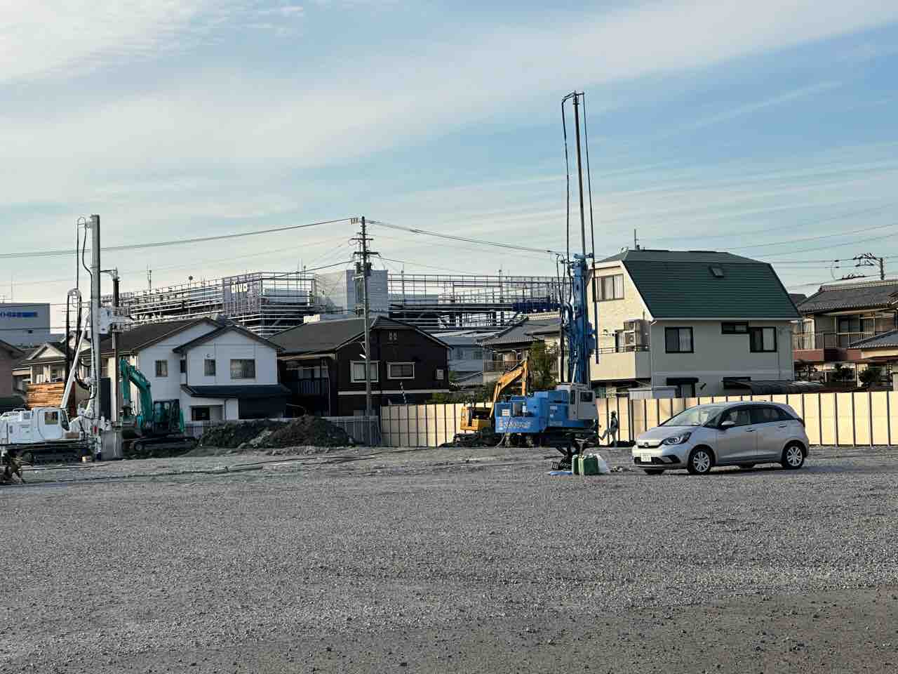 建設予定地では現在、基礎工事と地盤改良工事が進む初期段階にあります。敷地は砕石で均され、杭打ち機や掘削重機、セメントサイロが設置されており、地盤強化を中心とした作業が本格化。