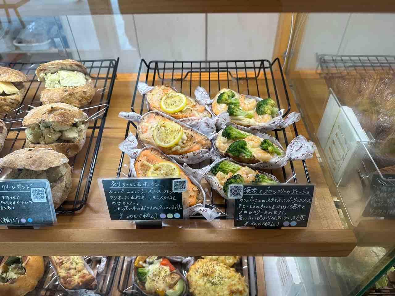 中でも目を引くのは、食事としての満足度が高い惣菜パン。「炙りサーモン&オニオン」や「海老とブロッコリーのアヒージョ」など、パン屋の枠を超えたデリのような組み合わせが並びます。素材の組み合わせや味の構成が丁寧で、「今日はどれにしよう」と迷う時間さえ楽しみになります。