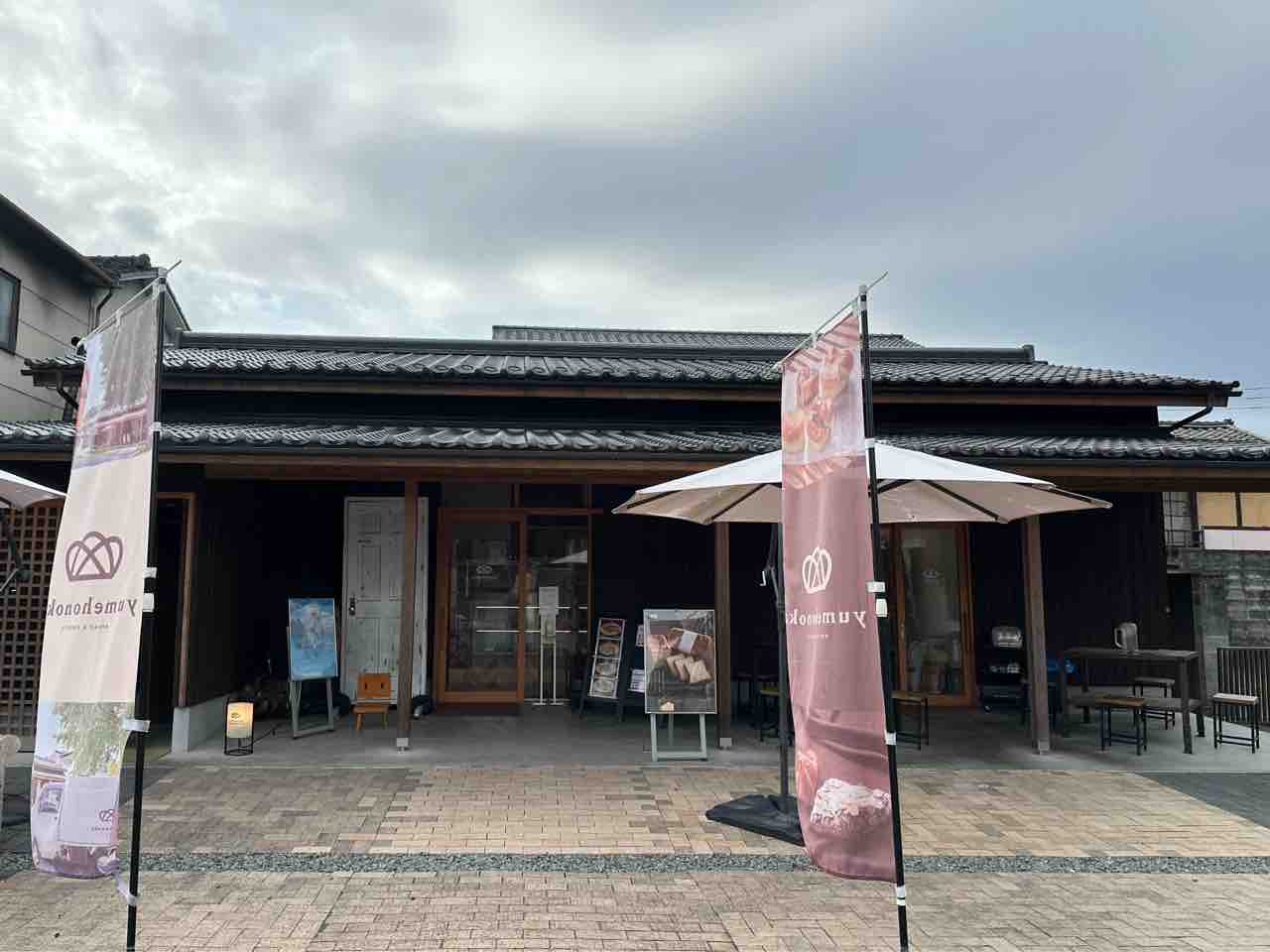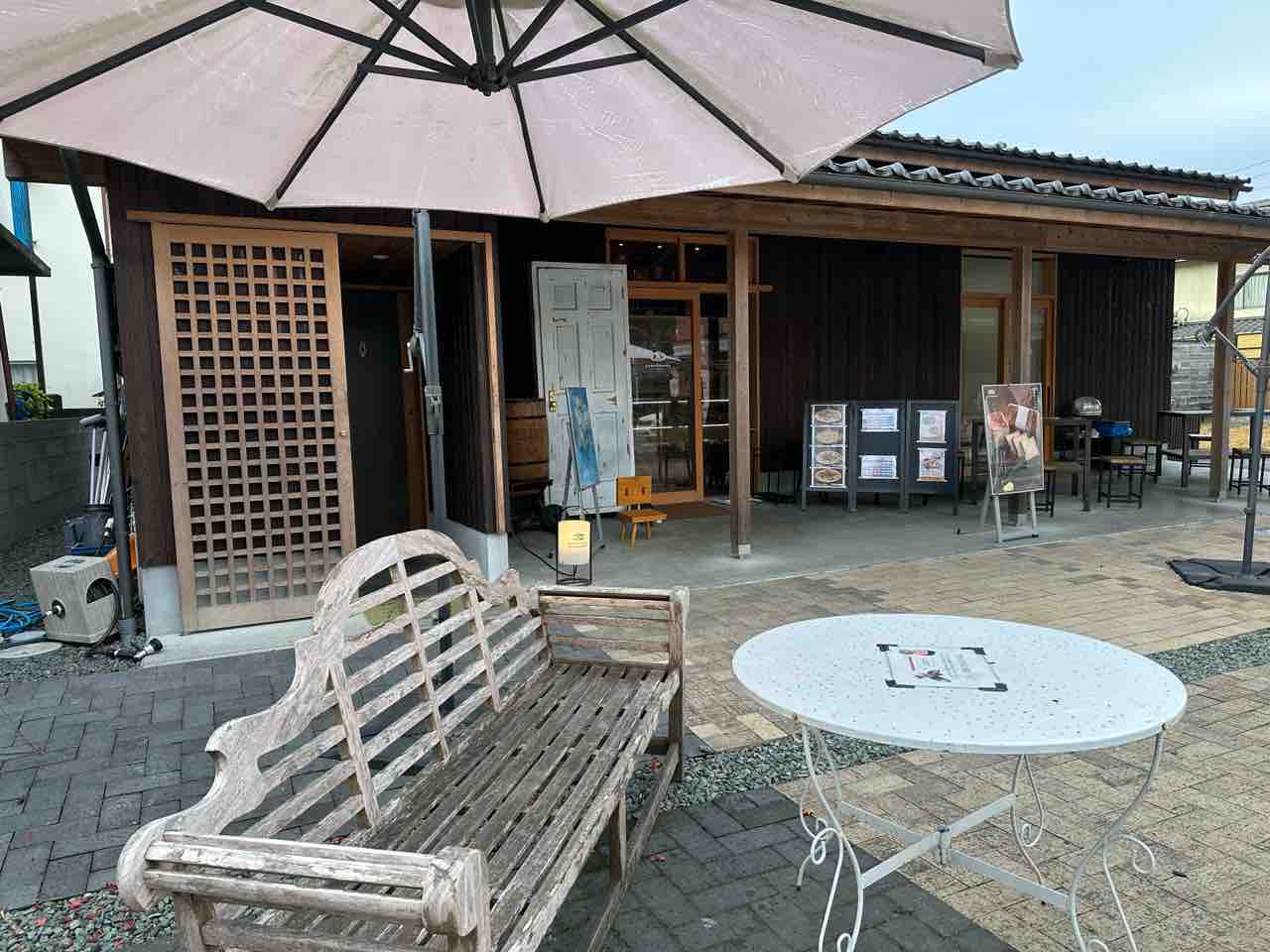 軒先にはテラスが広がり、木製テーブルと椅子、パラソルが並ぶ様子は、天気の良い日にここでパンを味わう光景を自然と想像させます。