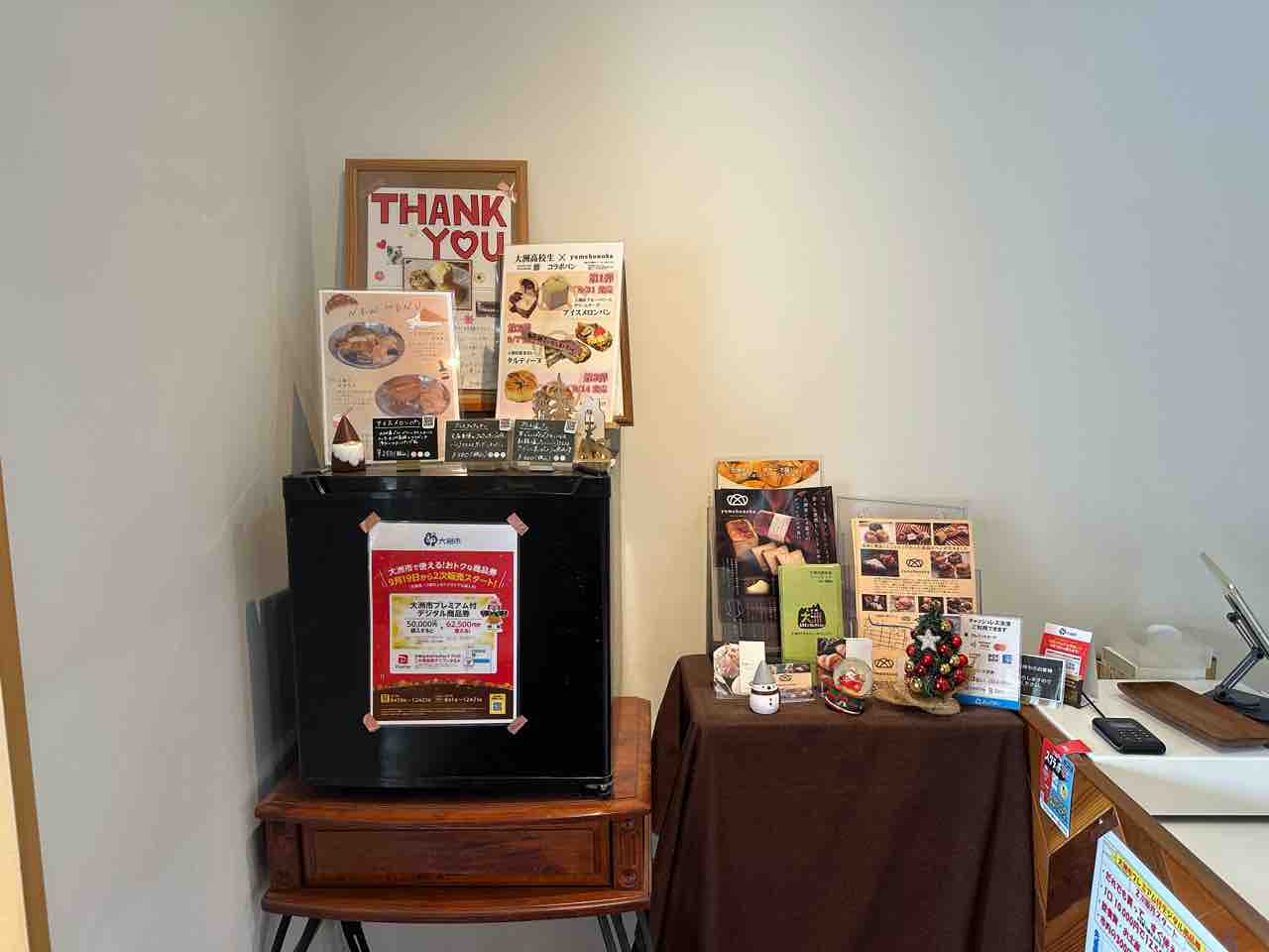 入口左手には、レジ横の小さなディスプレイスペースがあり、季節感のある飾りや手書き風のメッセージが添えられています。「THANK YOU」の言葉一つにも、お店の人柄がにじみ出ており、訪れる人との距離の近さを感じさせます。