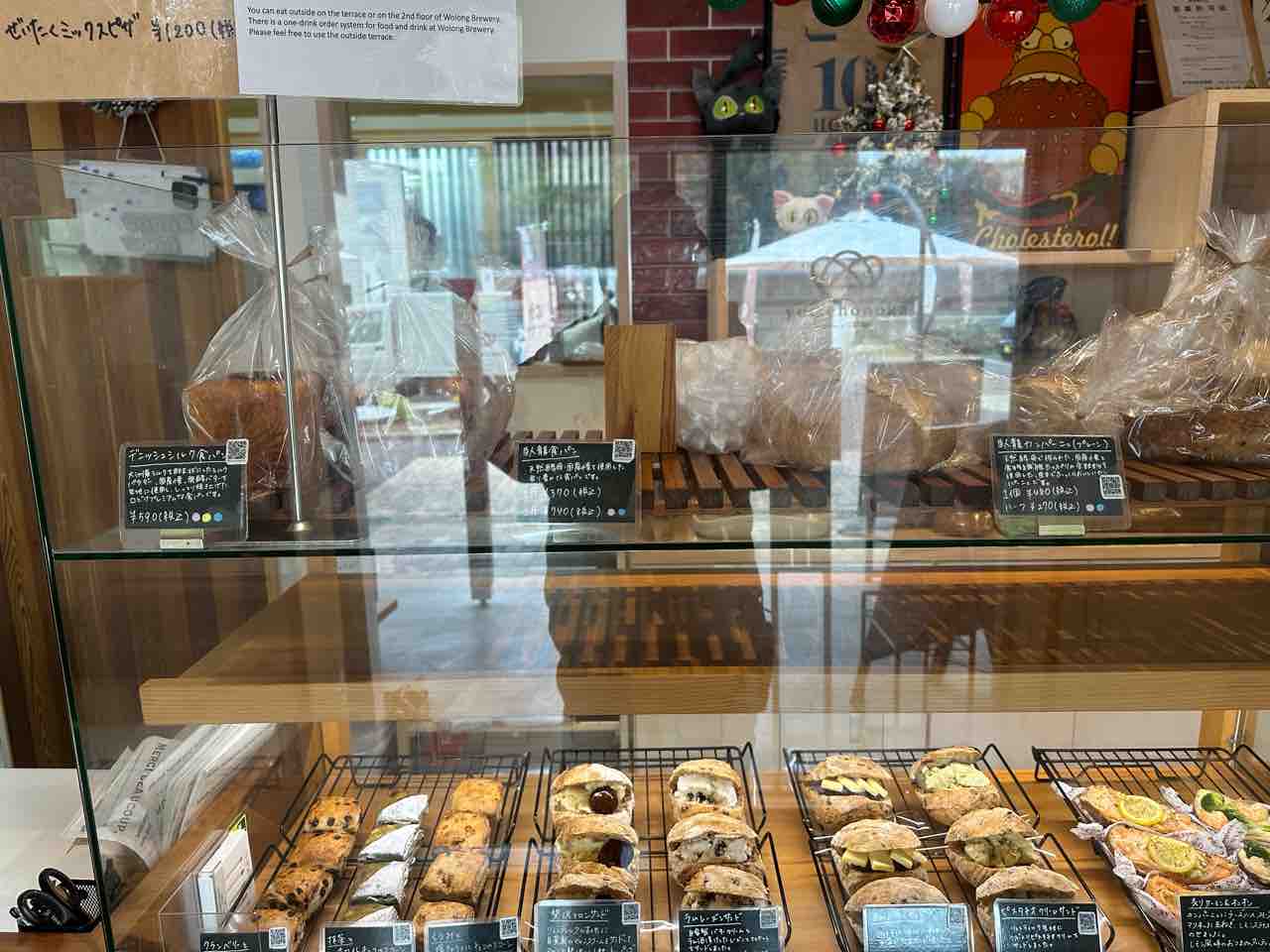 正面にはガラスケースが並び、惣菜パンから甘いパン、焼き菓子までが整然と陳列されています。商品一つひとつに名前と説明が添えられ、選ぶ時間さえも楽しいひとときに。