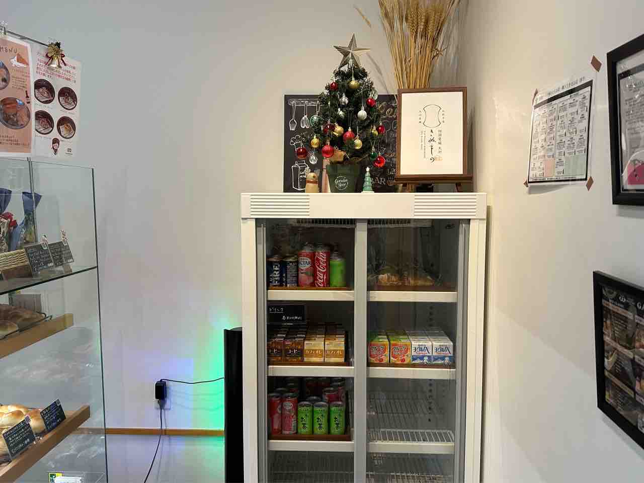 右手には冷蔵ケースがあり、ドリンクや冷蔵商品が並びます。全体を通して、清潔感と温かさが共存する、居心地の良いパン屋さんです。