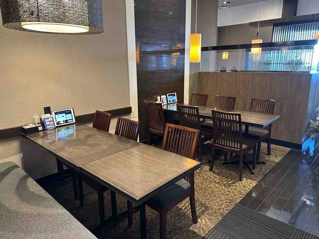 カウンター席やテーブル席など種類が豊富で、一人利用、友人、家族に対応。注文用タブレットも設置され、人目を気にせず自分のペースで注文できる点が快適でした。