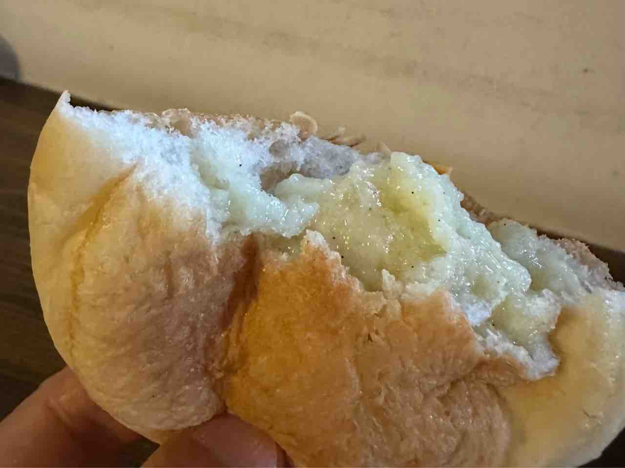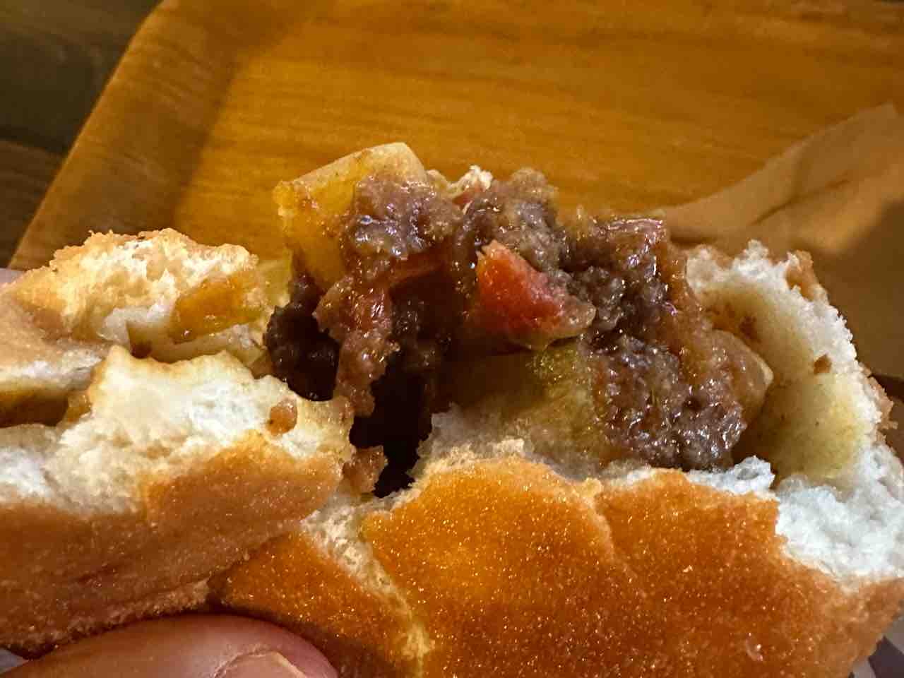 カレーパンは人気商品、外せません。 パンの外側は、ひと口かじると驚くほどザクザクと香ばしい食感。中には、手作り感あふれる大きめにカットされたポテトと、肉の旨味が濃厚なひき肉が隙間なく詰まっていて、圧倒的な食べ応えがあります。