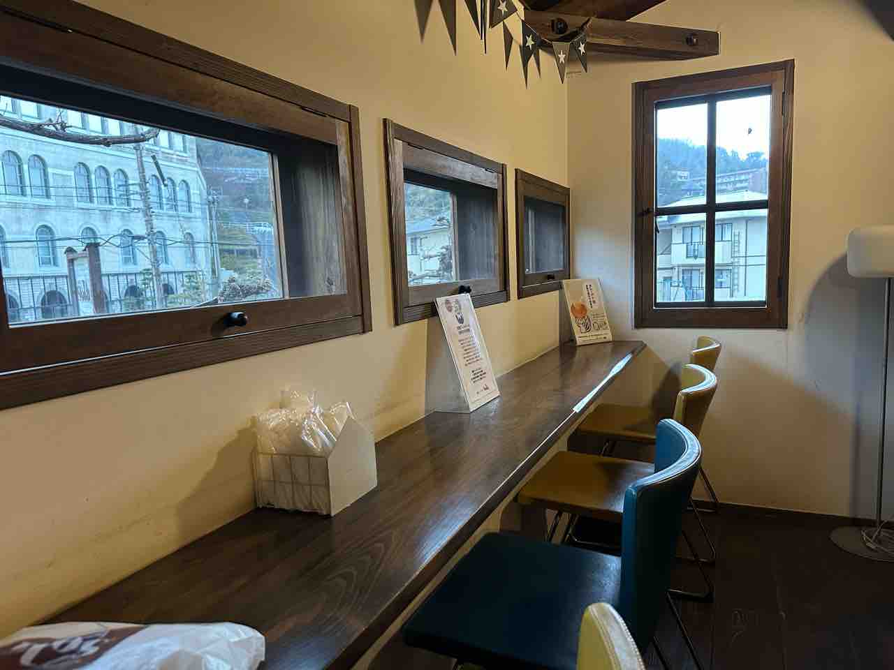 2階イートインコーナーでは、窓から祝谷の落ち着いた景色が望め、静かな時間が流れます。木製のテーブルと椅子は座り心地がよく、パンの香りとともにゆったりと過ごすひとときは格別です。