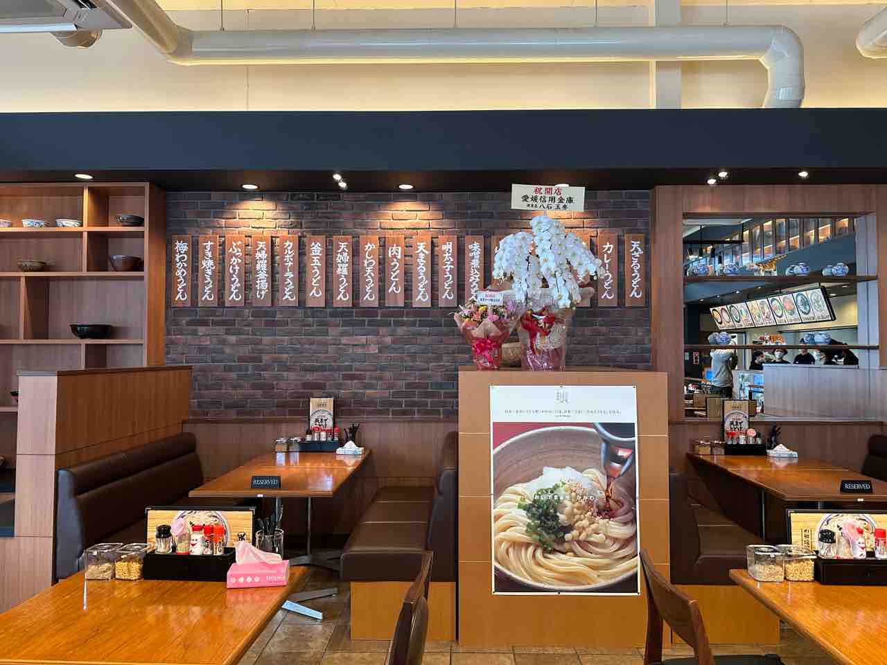 開店祝いの花が並ぶ様子からは、地域に待たれていたお店だということが伝わってきます。駐車場も広く、車での来店が多い松山では嬉しいポイントです。