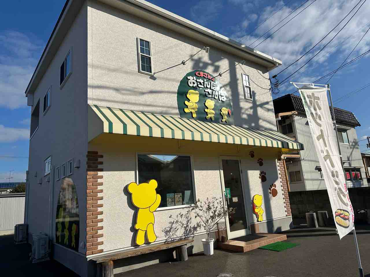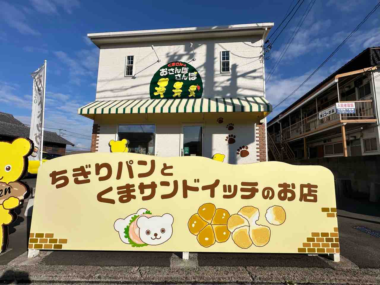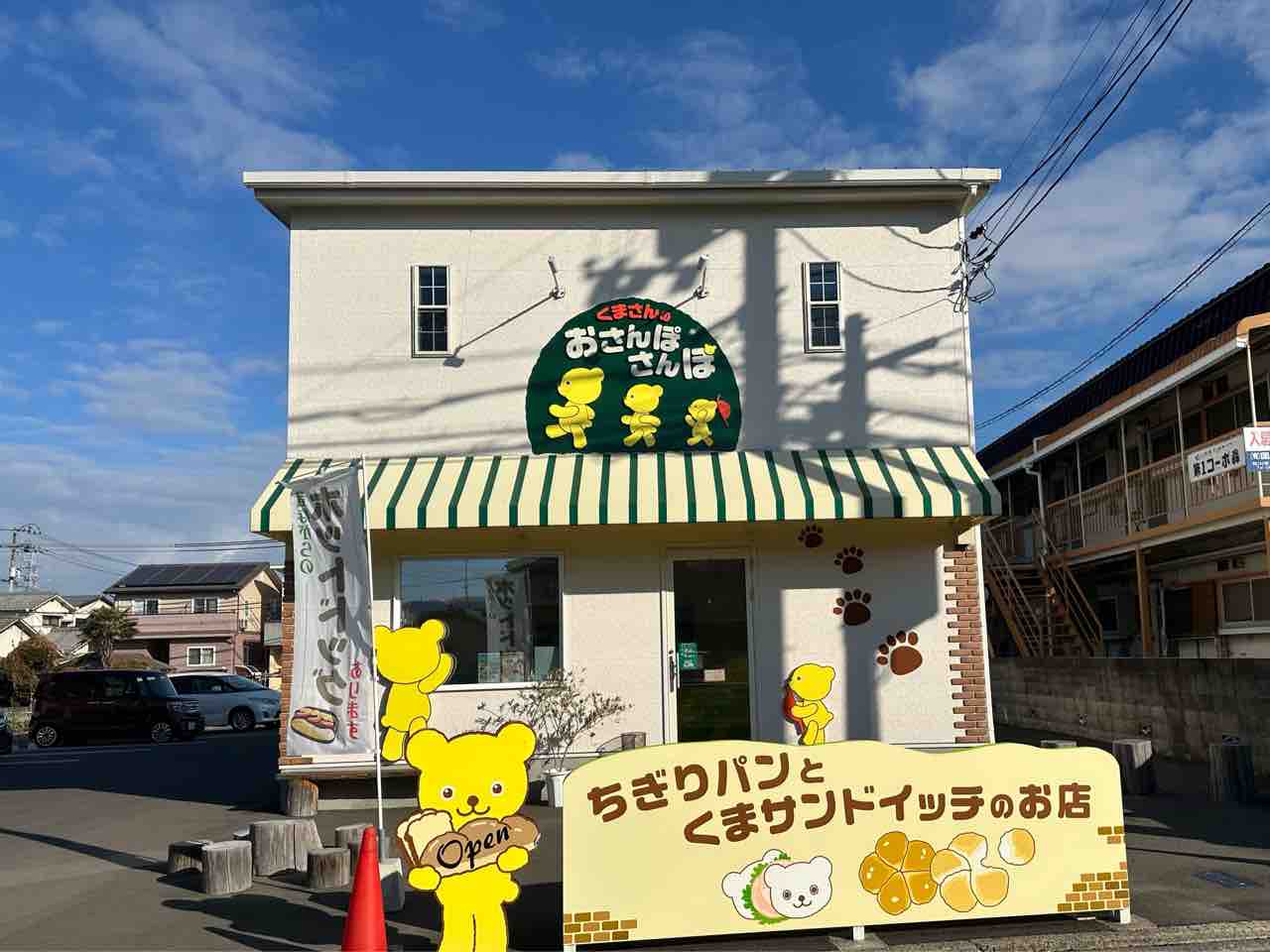 松山市西石井の閑静な住宅街を進むと、思わず足を止めてしまうほど可愛らしい建物が見えてきます。ここが、ちぎりパンとくまサンドイッチの専門店「くまさんのおさんぽさんぽ」です。 清潔感のある白壁をベースにしたナチュラルな外観。 正面には大きなグリーンの看板が掲げられ、楽しそうに行進する3匹の黄色いくまさんが描かれています。
