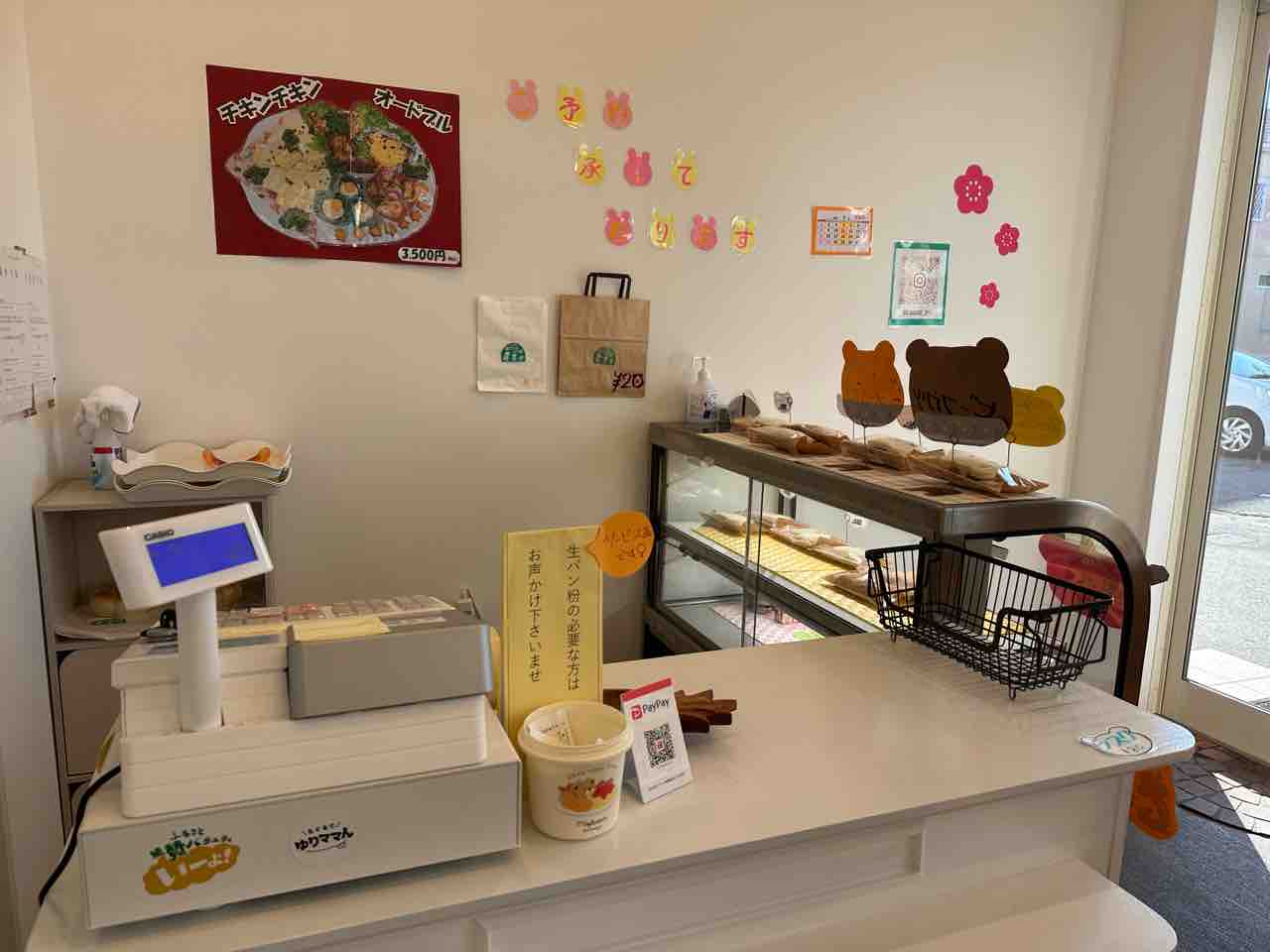 白を基調とした店内には、くまさんやお花の手作り装飾が施され、どこかアットホームな空気感。 床に描かれたくまさんの足跡など、小さなお子さまが喜びそうな工夫もあり、家族で訪れたくなるやさしい空間です。