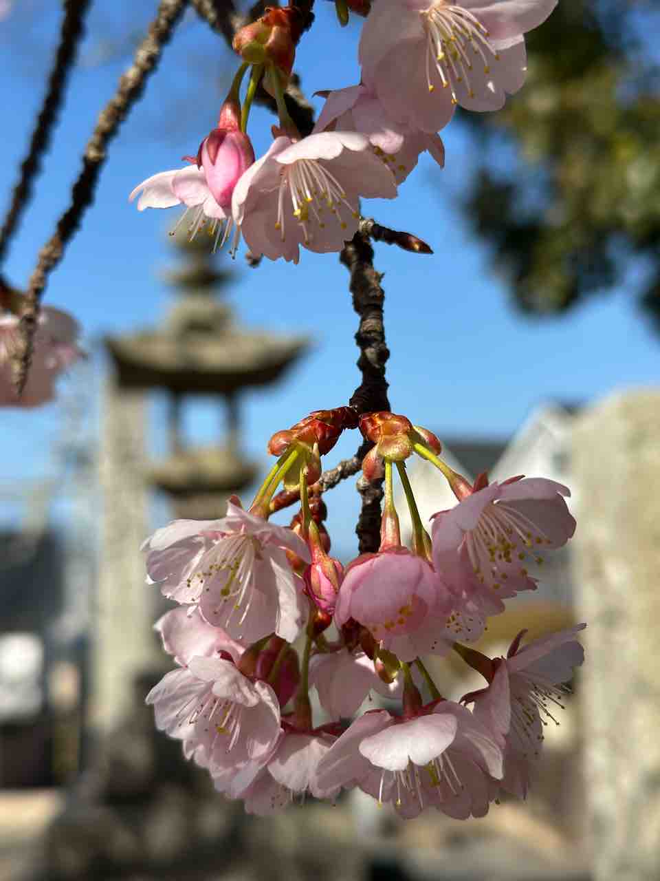 陽当たりのよい枝では花がやや多く、日陰側にはつぼみが多く残っていました。満開に向けて、日ごとに景色が変わっていく様子が想像できます。 社殿の前に立つと、瓦屋根と薄紅色の花が美しく調和し、石灯籠や鳥居が風情を添えています。青空を背景に見上げる桜は、決して派手ではありませんが、心にすっと染み入るような佇まいでした。今はまさに、見頃へと向かう静かな序章といえるでしょう。