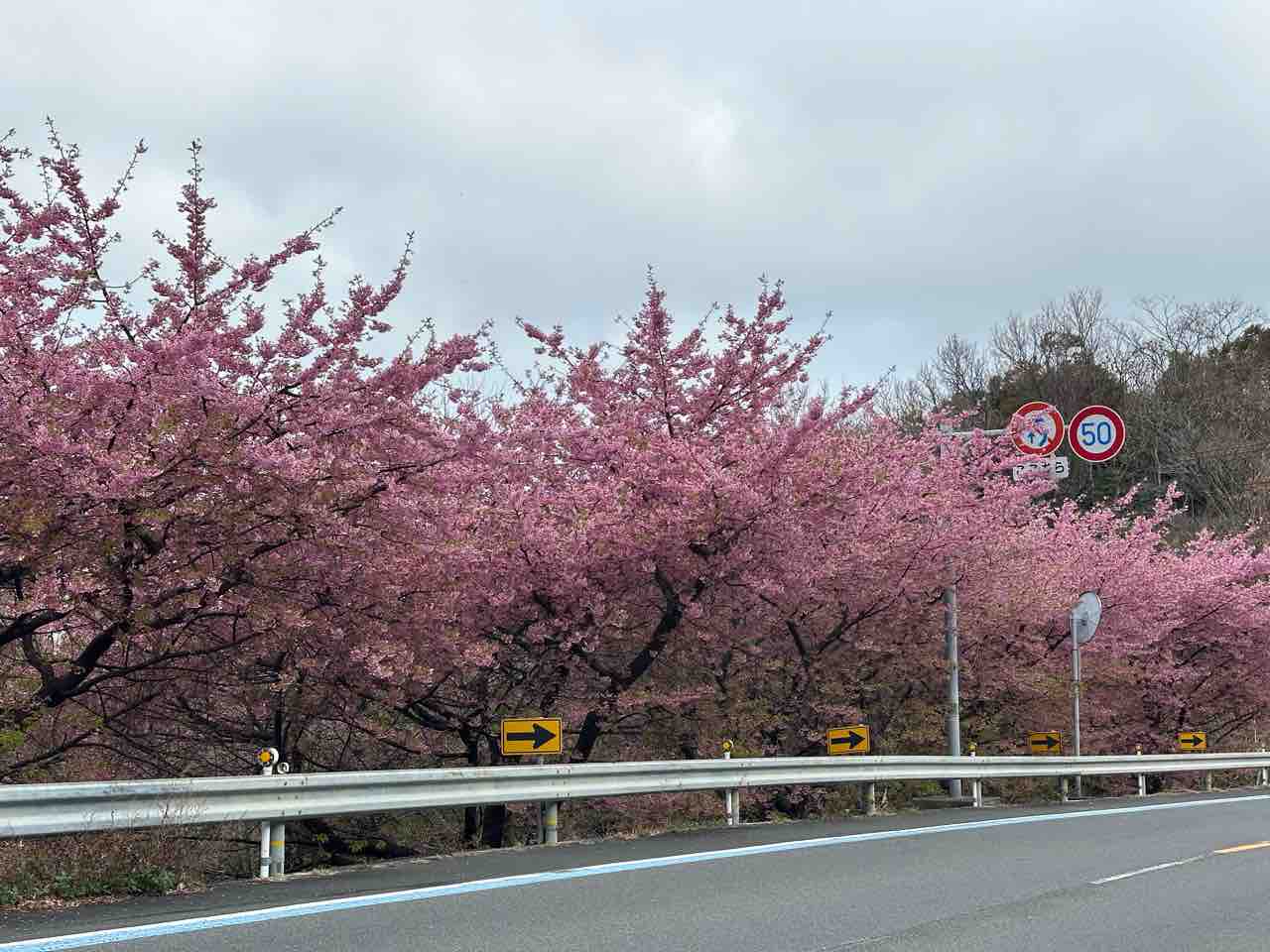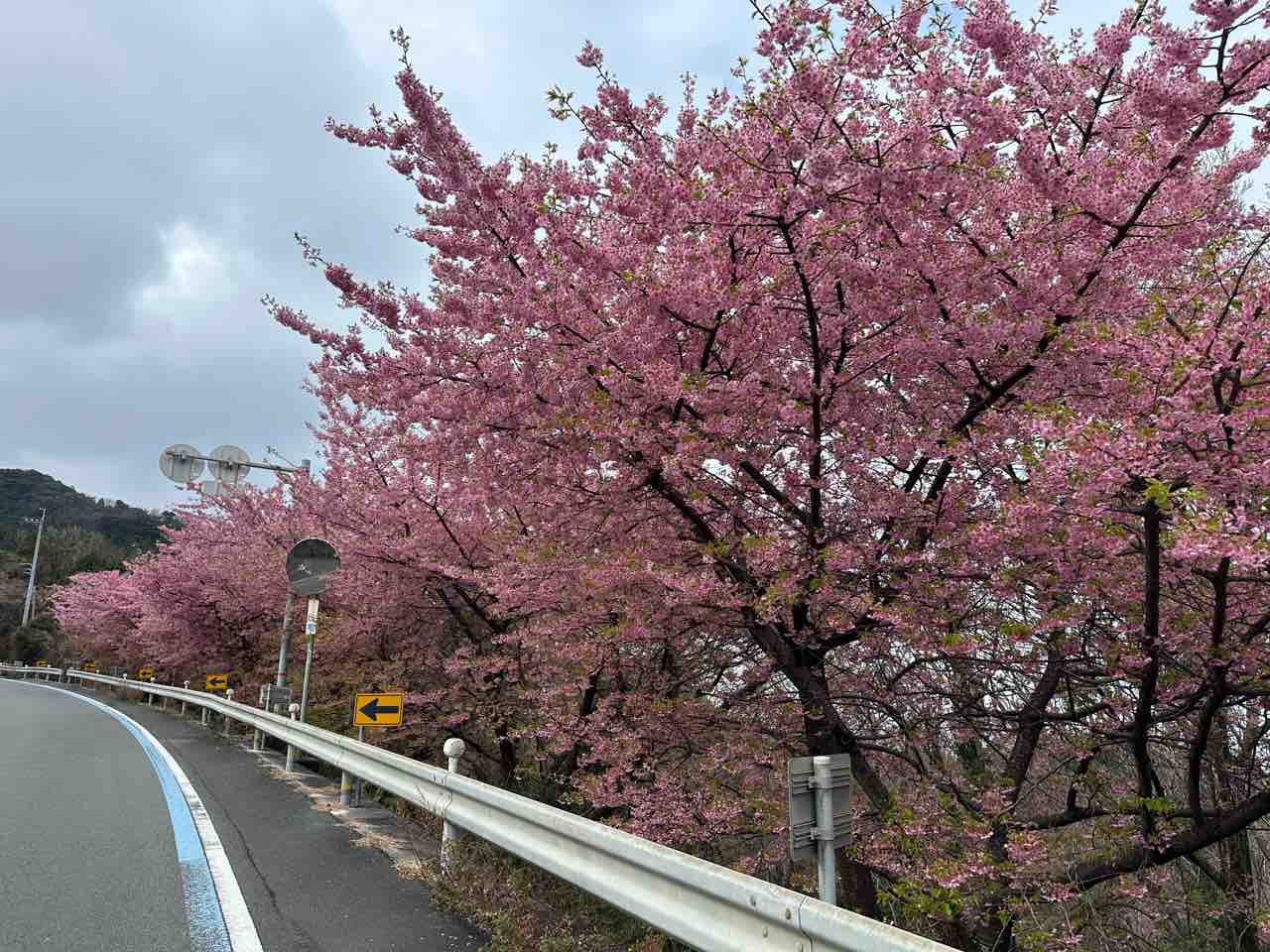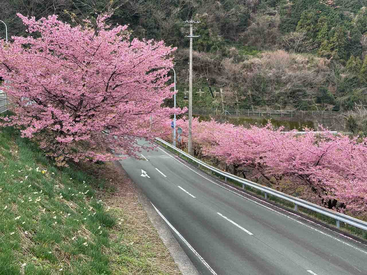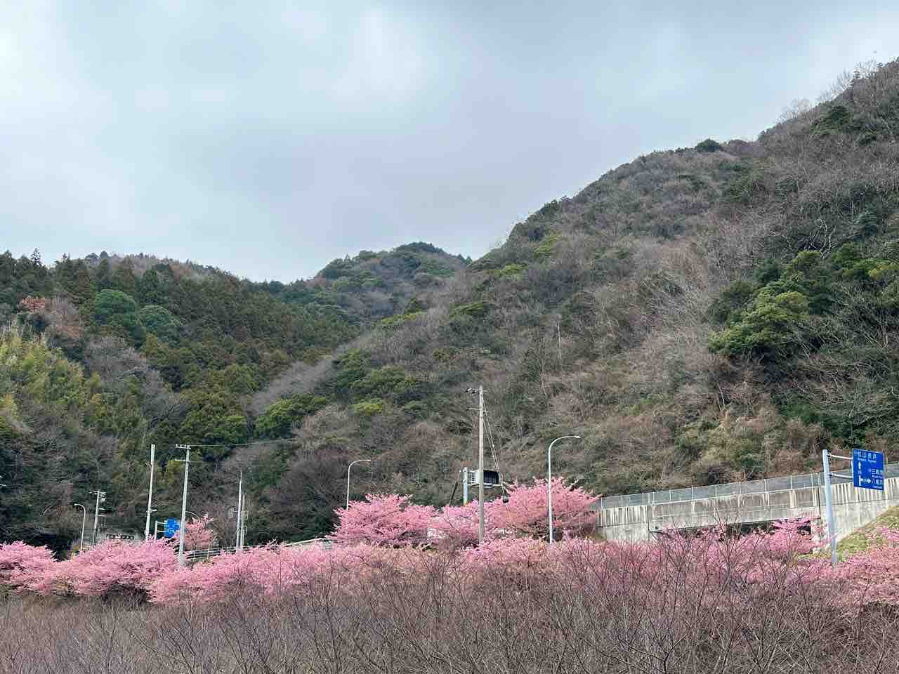 国道378号を走り、緩やかなカーブを抜けた瞬間、右手いっぱいに広がる「河津桜」が視界へ飛び込んできます。その鮮やかな桃色に、思わず「来てよかった」と感じるほどの美しい光景でした。