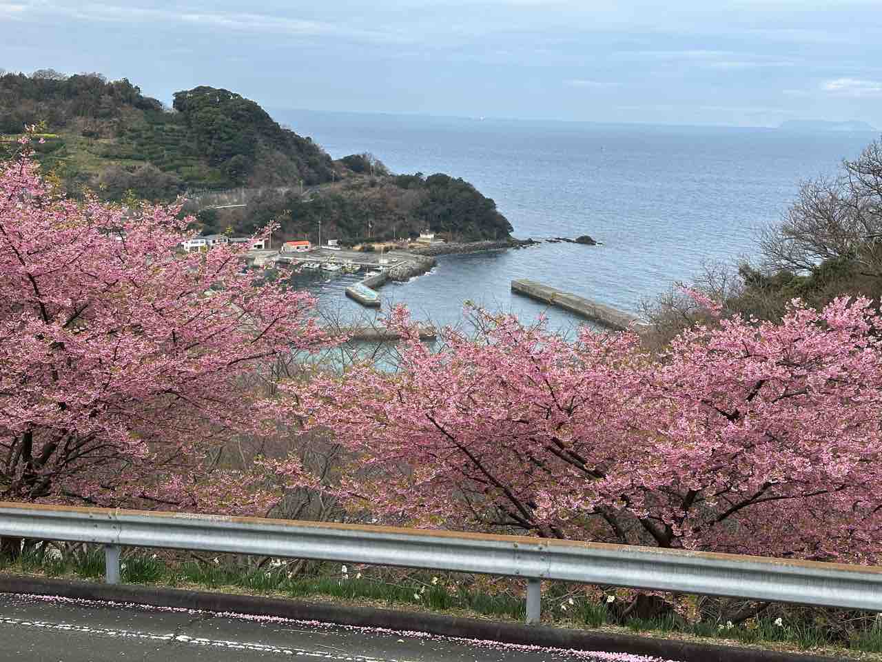道路沿いを覆うように咲く河津桜を間近に感じながら進むと、やがて視界が開け、桜越しに穏やかな伊予灘が広がります。入り江に寄り添う港や防波堤、静かな海と満開の桜が重なり合う風景は、まるで一枚の絵画のよう。