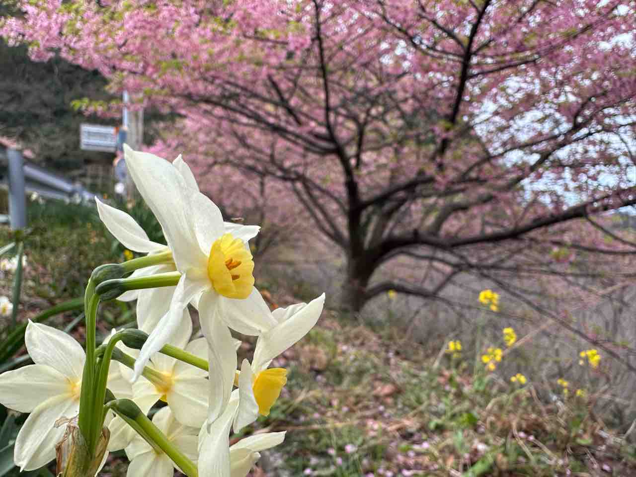 車を降りて歩いてみると、さらに心に残る光景に出会いました。「河津桜」の木の根元には、水仙の花が静かに咲いていたのです。