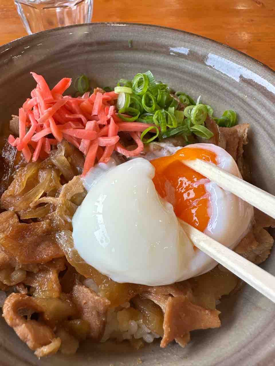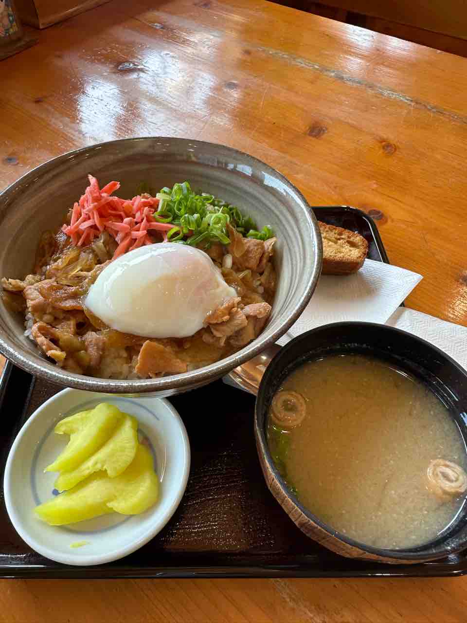 さらに、温泉卵(鬼たまご)がトッピングされており、黄身を崩してご飯と絡めると、まろやかでコクのある味わいに変化します。紅生姜の爽やかな酸味がアクセントとなり、最後まで飽きることなく楽しめました。 セットには、たくあん、味噌汁が付き、箸休めとしてのバランスも良好。