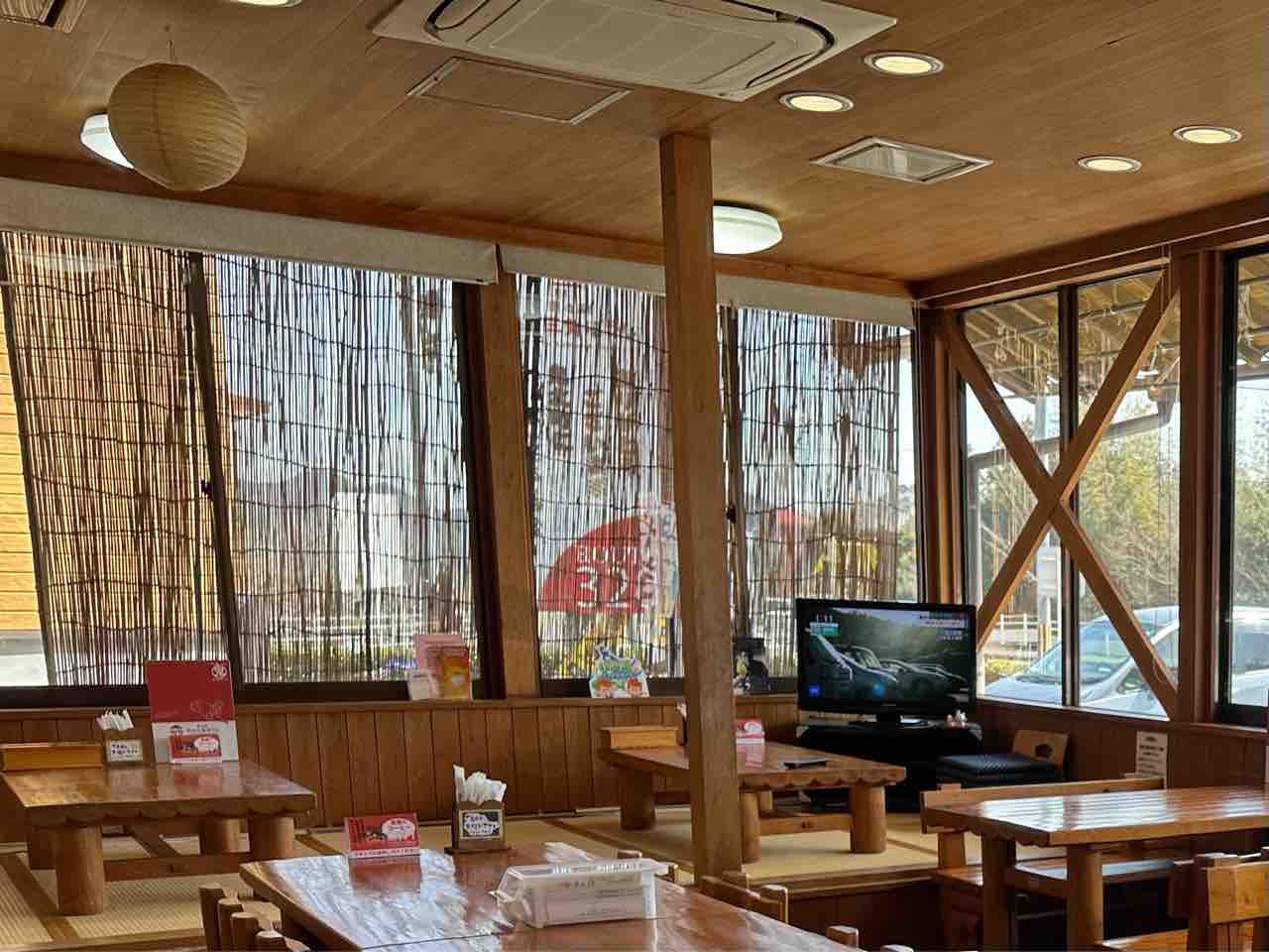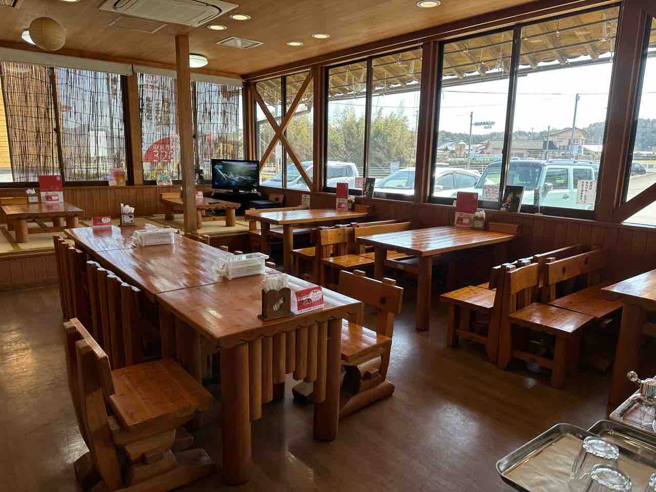 窓際の席からは駐車場や周囲の風景が望め、ゆったりとした時間を過ごすことができます。 座席は、木製のテーブルと椅子が並ぶテーブル席と、小上がりの座敷席が用意されており、グループでも一人でも利用しやすいレイアウトです。テーブル席はしっかりとした作りで、木の質感が温かみを演出。