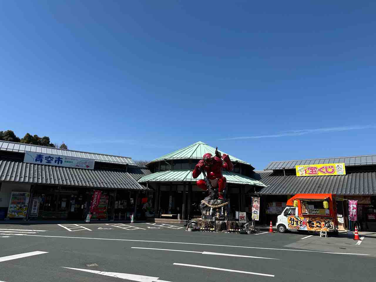 施設の左側には「青空市」と書かれた看板が掲げられ、新鮮な地元の農産物や特産品が並んでいることがうかがえます。