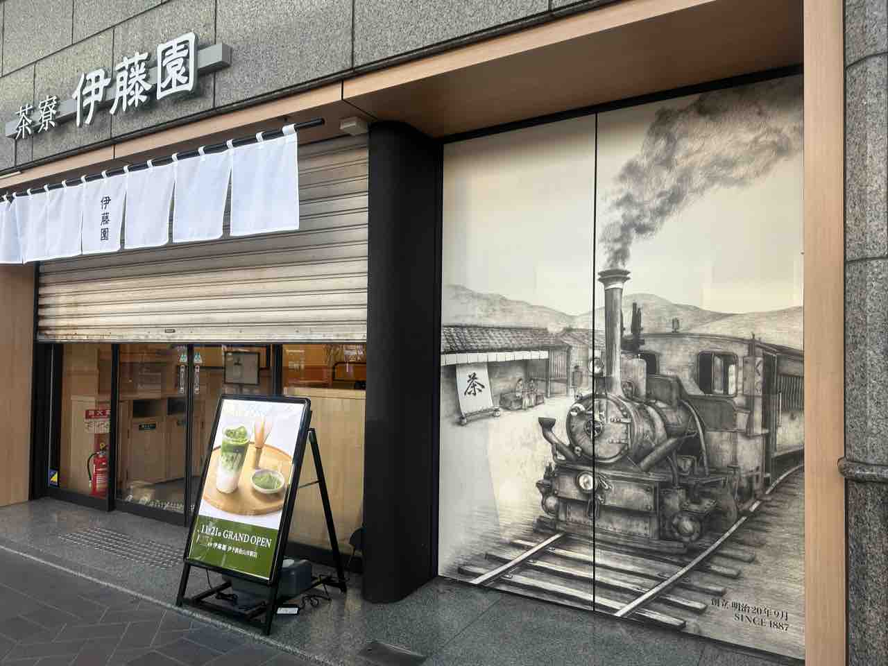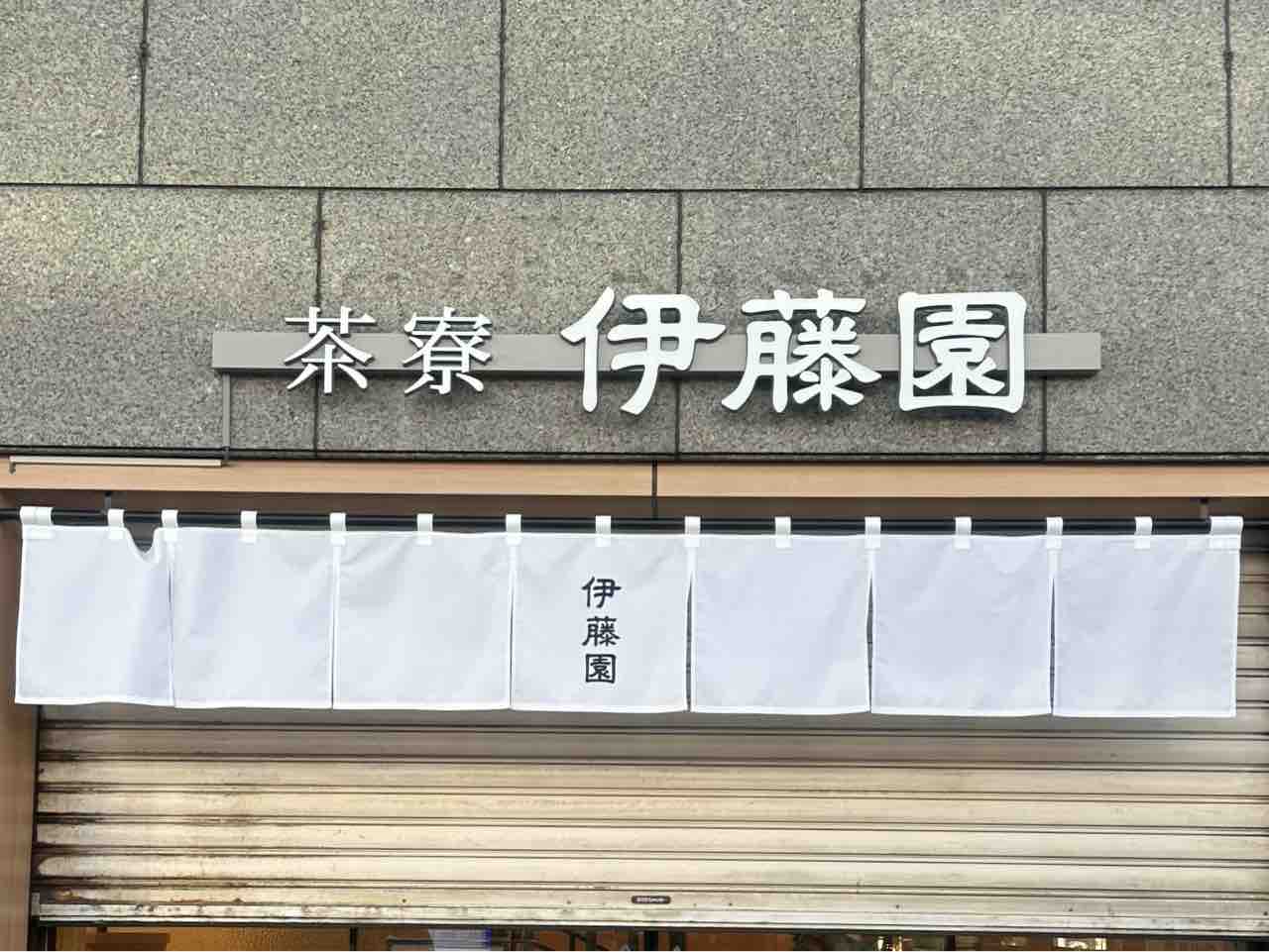 実際に店舗前まで訪れた際、まず目を引いたのは、駅前の景色にすっと溶け込みつつも、上品な存在感を放つ建物でした。グレーの石材調の外壁がモダンな印象をつくり、その一階に落ち着いた表情で佇んでいます。 白地の暖簾には「伊藤園」の文字。