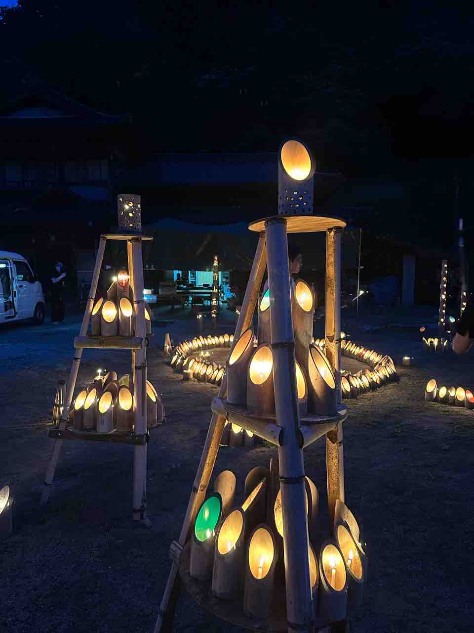 夜の暗闇の中で灯籠の光が浮かび上がり、まるで竹が生きているかのように見えます。その光景は、まさに一見の価値があります。
