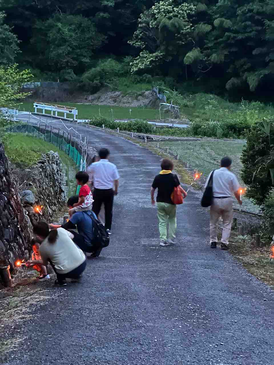 訪れた人々が竹灯籠のロウソクに一つ一つ楽しそうに火を灯していました。