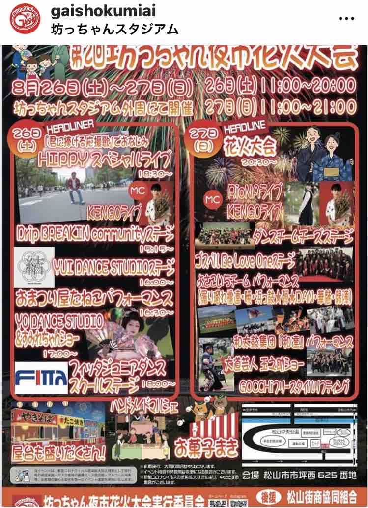 「第2回坊っちゃん夜市花火大会」が「松山中央公園坊っちゃんスタジアム外周」で8月26日(土)〜27日(日)の2日間開催されます。